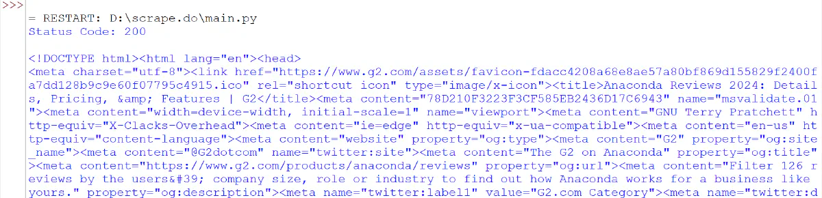 When you execute this code, it bypasses CAPTCHAs and retrieves the HTML content from G2's review page.