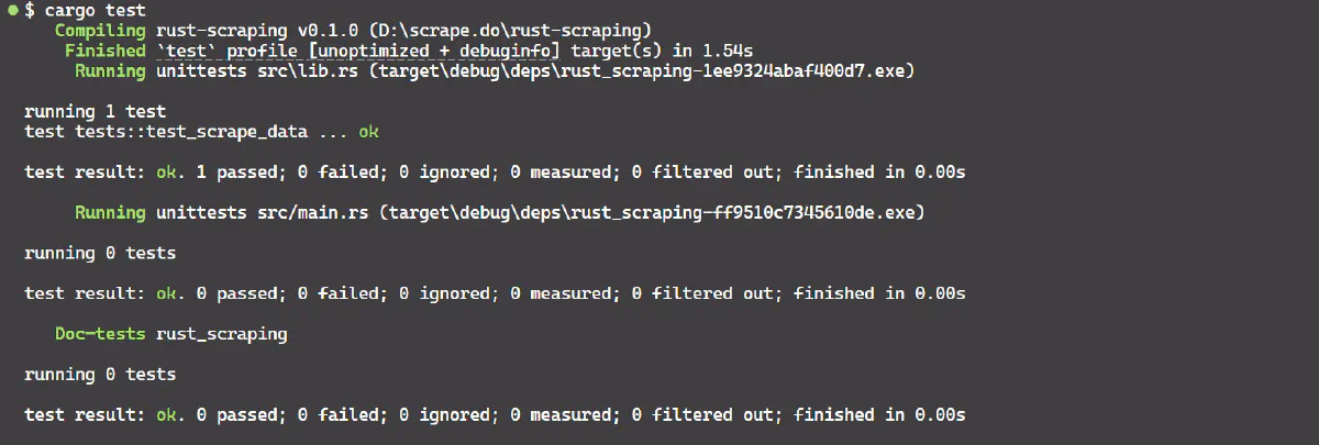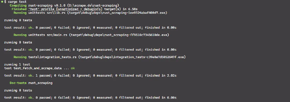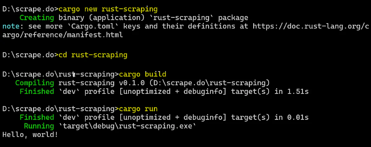 Let's get started with Rust! To create a new Rust project (rust-scraping in my case), open your terminal and run the following Cargo new command: