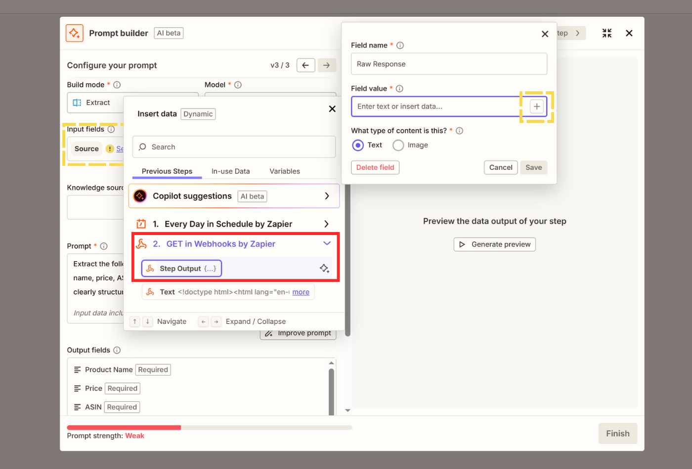 - In Input fields, we'll select what we scraped in the second step as source. Click Select field value, name your data source, then click + in Field value and click on the second step titled Get in Webhooks by Zapier and pick Step Output.
