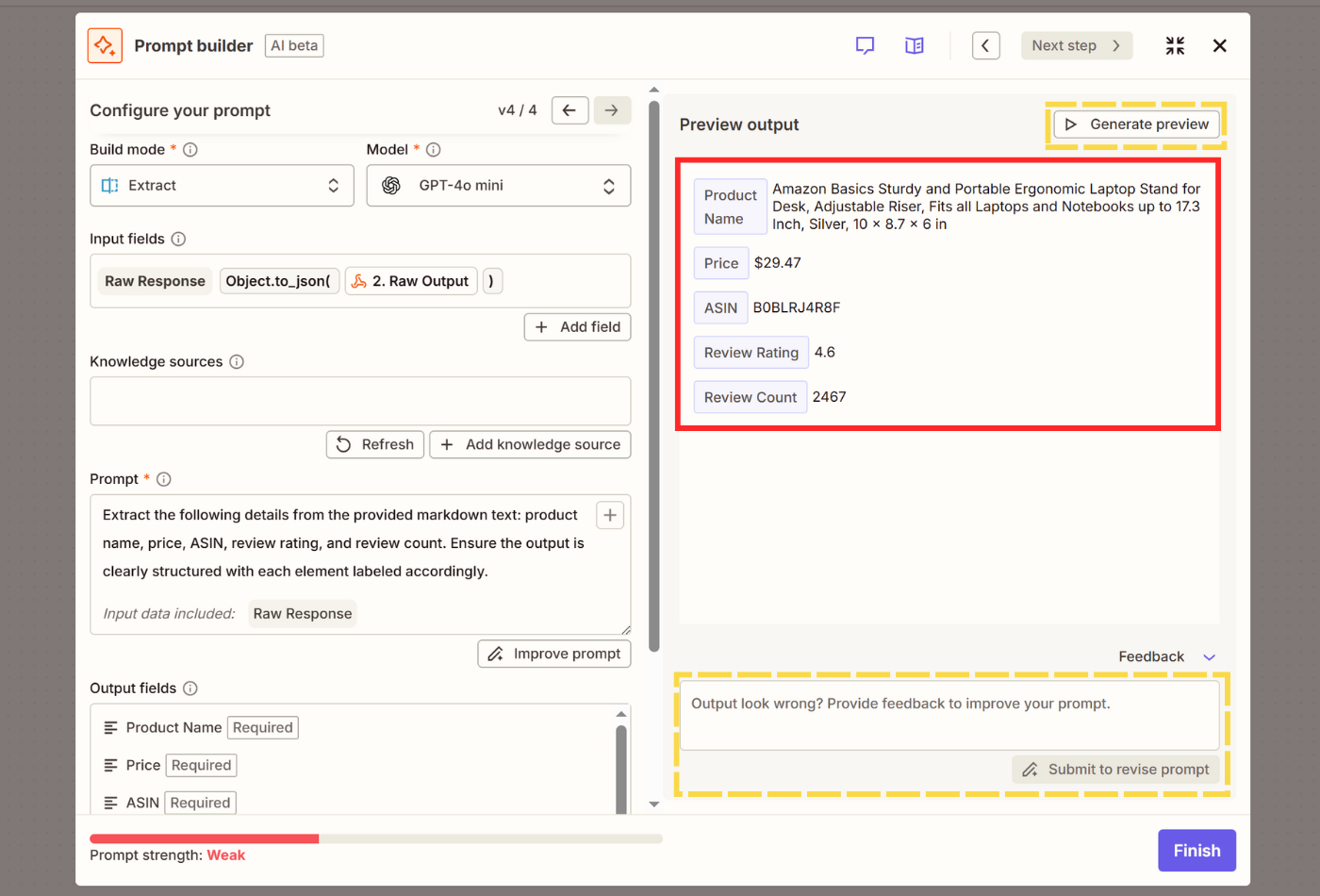 - Fill out the Prompt field. Explain specifically what you want to extract from the raw response in plain English. Click on Improve prompt.