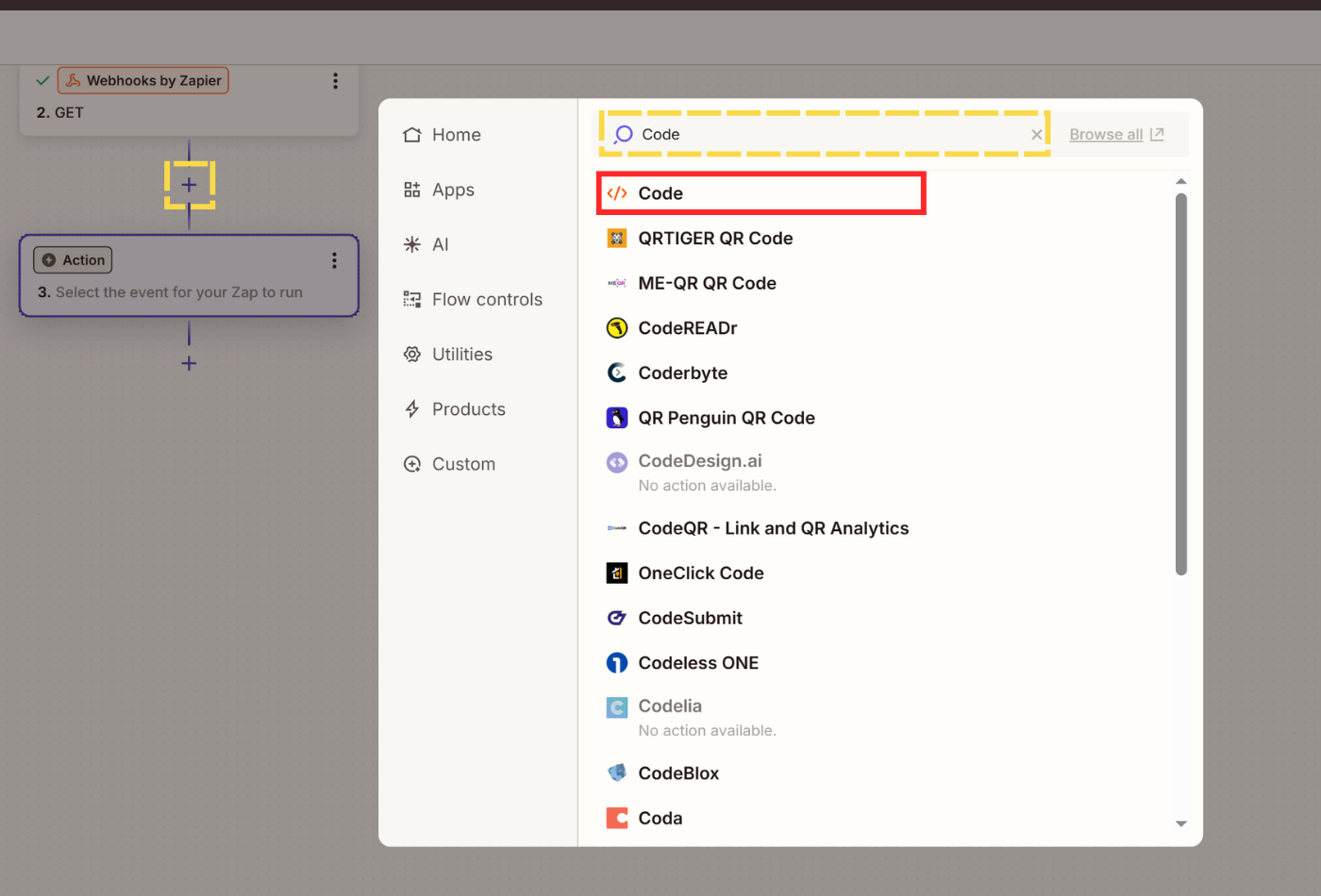 - Click + Add step and search for Code to select Code by Zapier as your event.