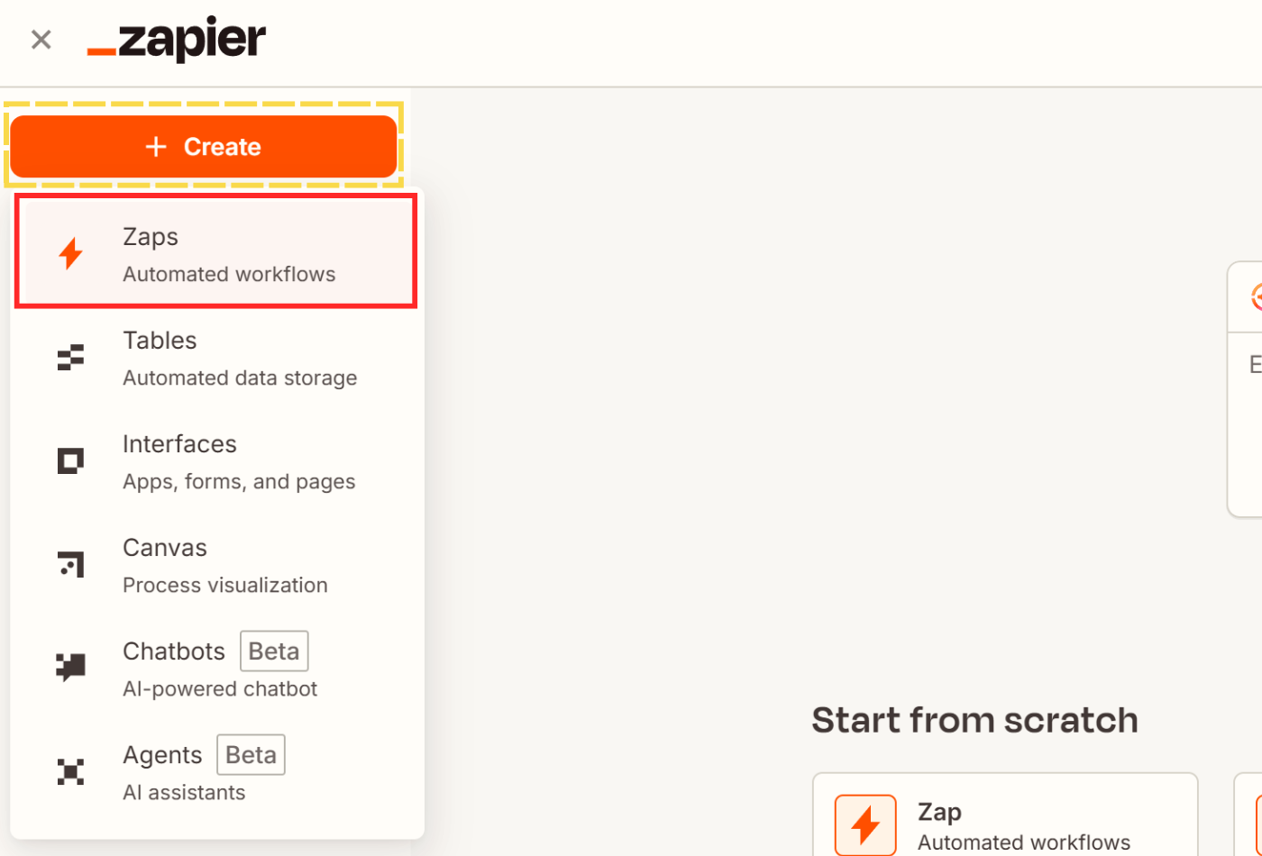 - From your dashboard, click the orange rectangle with + or + Create and select Zap.