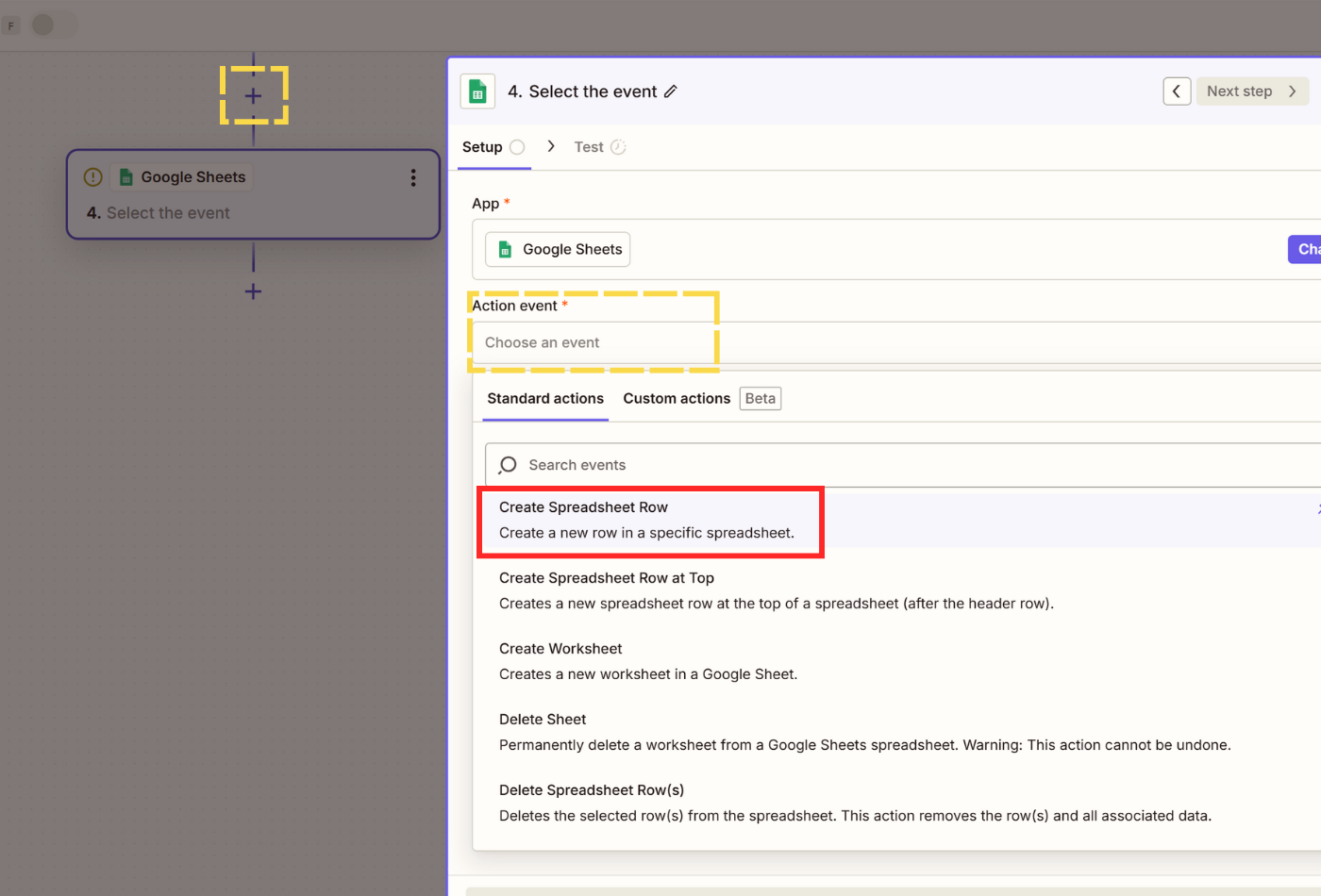 - Click on + Add step and select Google Sheets.