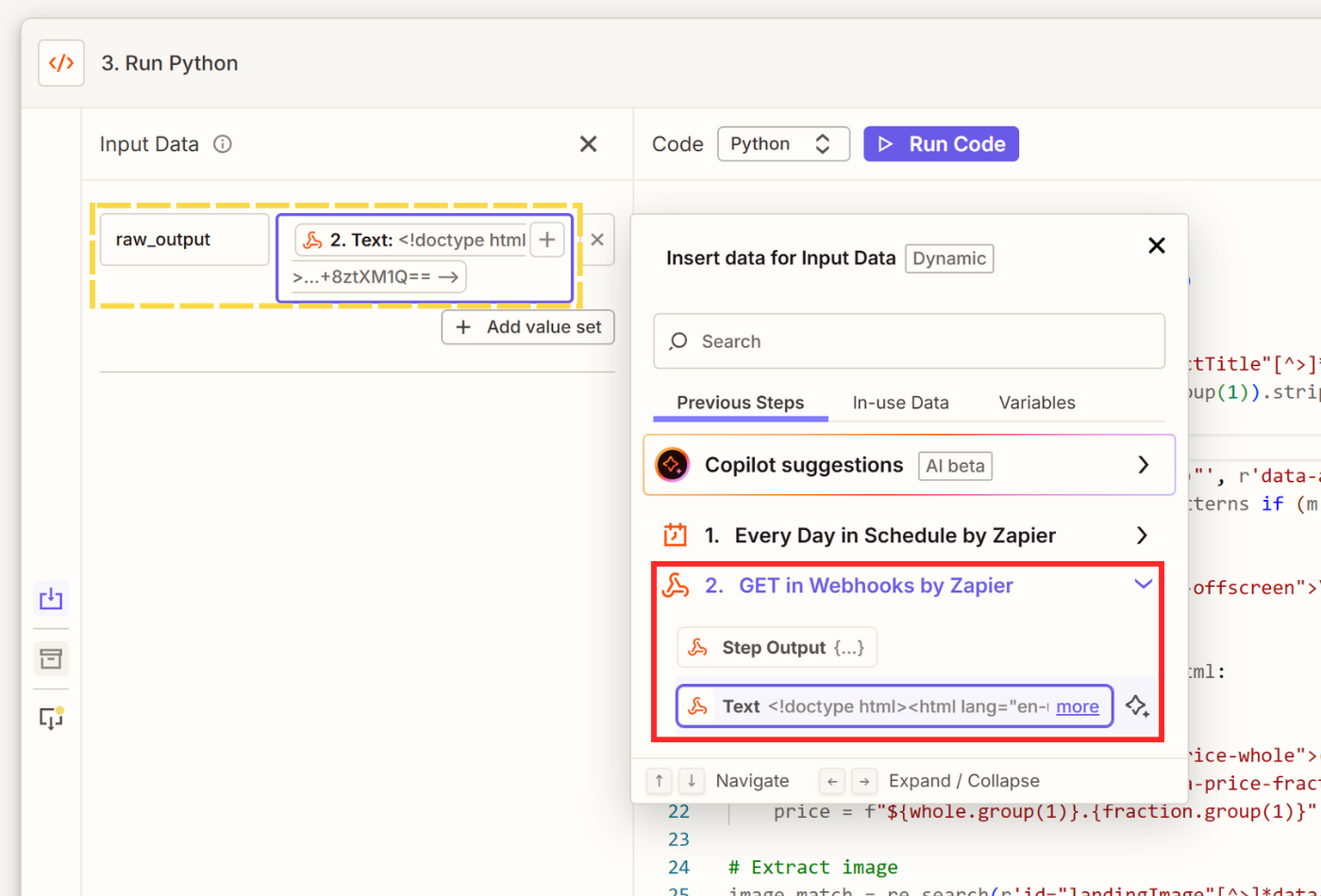 If your Zap is scraping one website with a more static layout, you can use Code by Zapier to extract product details and save on performance + AI credits.