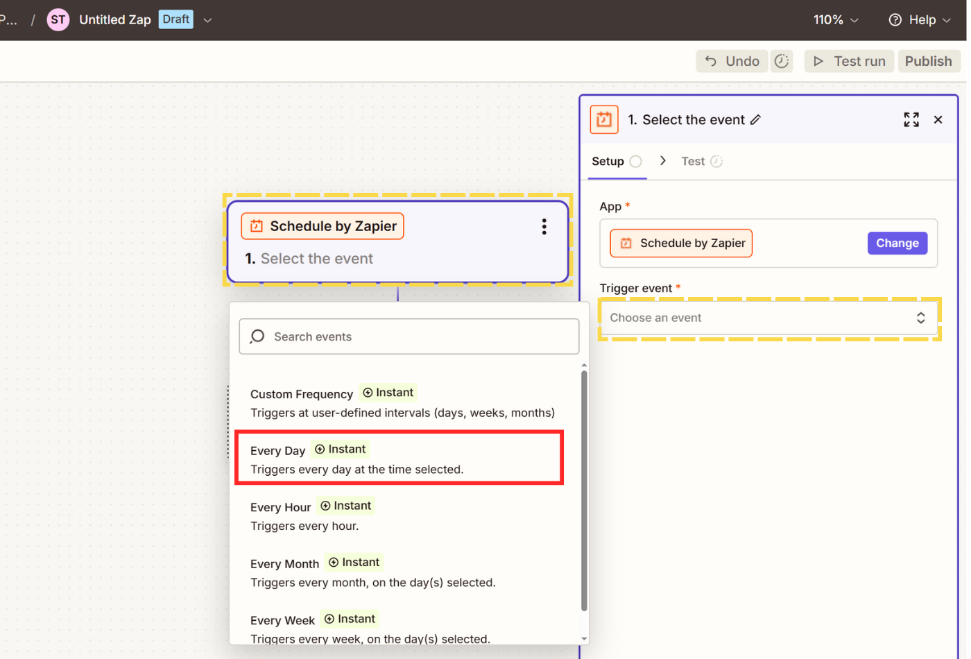 - Click on Trigger and select Schedule, then choose Every Day as your Trigger event.