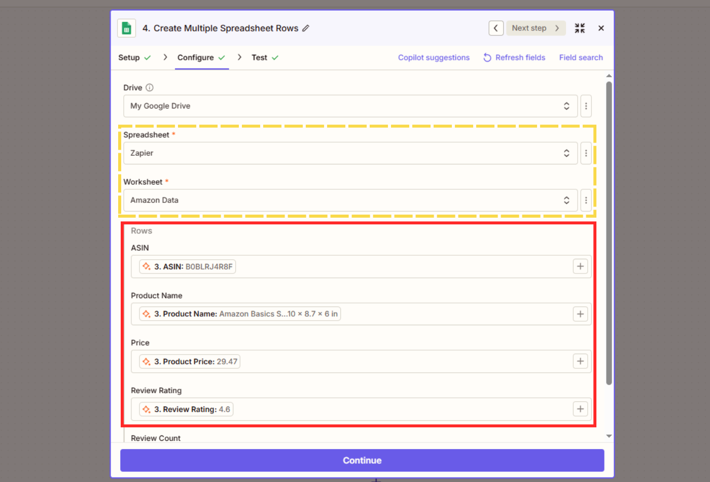 - In the Configure step, select the Spreadsheet and Worksheet you've created.