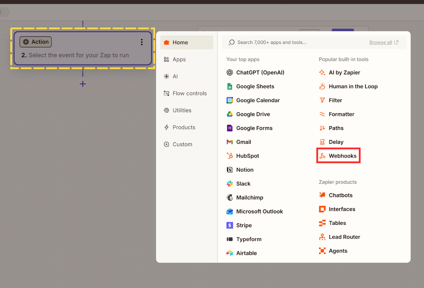 - Our main action is sending a webhook request to Scrape.do. Click on your action step and select Webhooks as your action app.